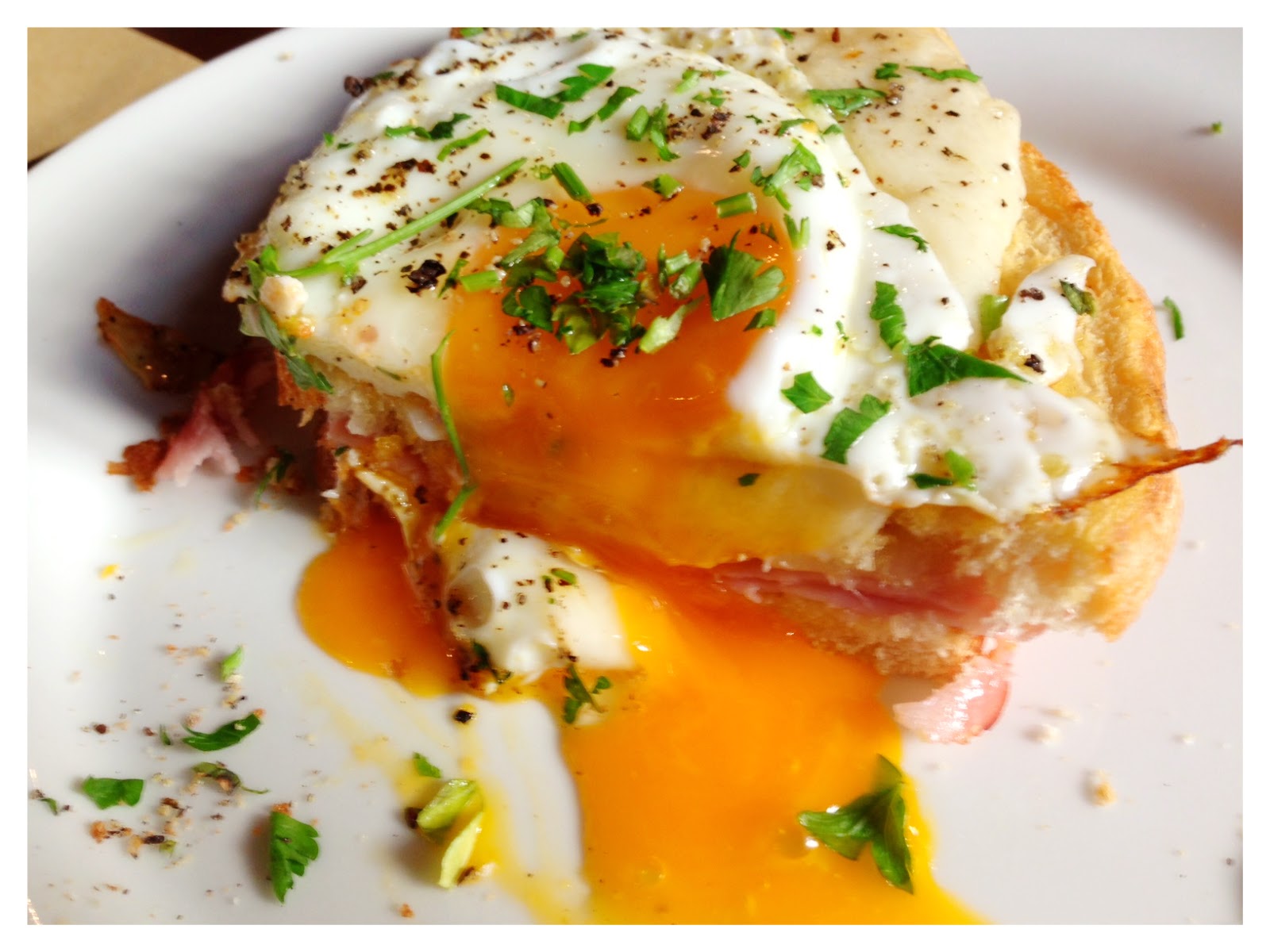 Melting egg on toasted bread with jamon