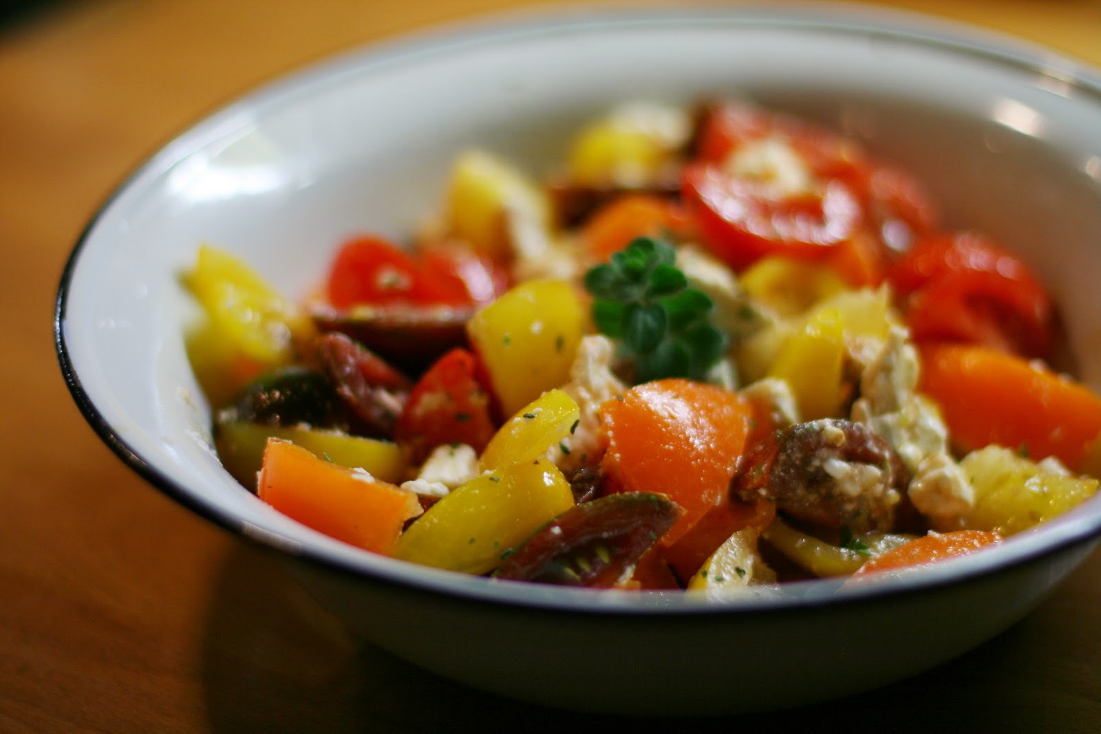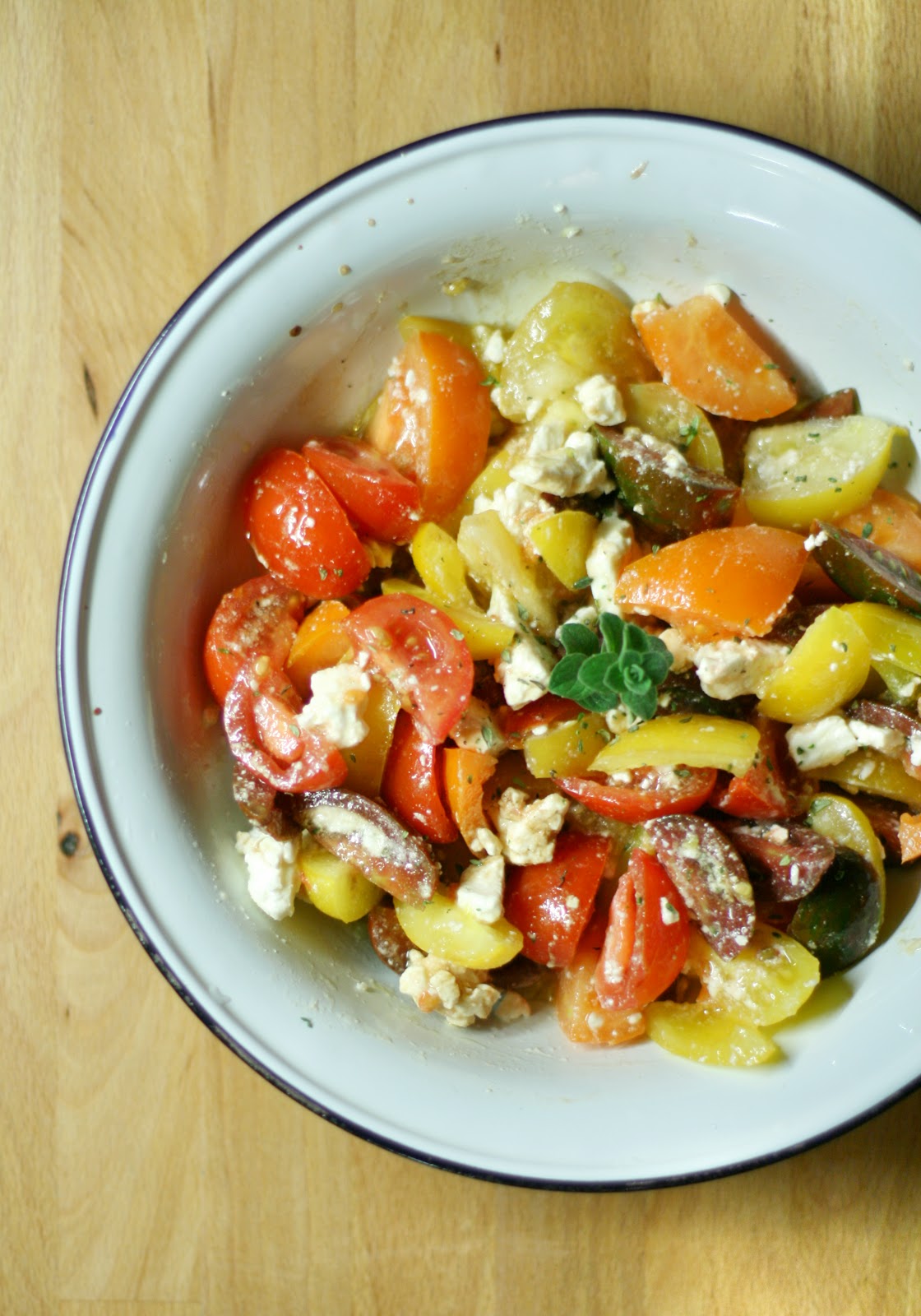 Yellow Orange & Red Tomatoes with Feta cheese and fresh oregano
