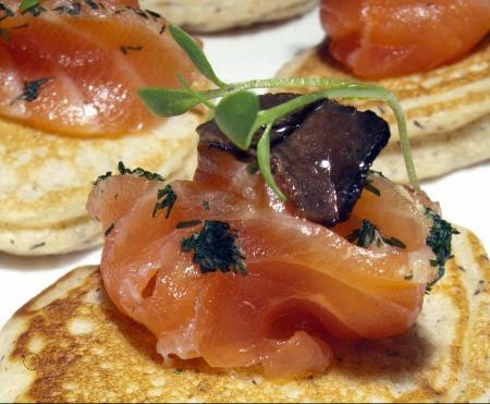 Marinade the salmon for 30 minutes in a mixture of Appennino truffle salt, sugar, cognac, ginger and marjoram. Wash it quickly and store it in the fridge for one day and let the salt get absorbed. To prepare the blinis melt the brewer's yeast with milk at room temperature, and then add all the other ingredients (at the butter previously melted last) and mix. Let the dough stand for 2 hours more or less, out of the fridge. Cook the little blinis on both sides in a nonstick pan and let them cool.